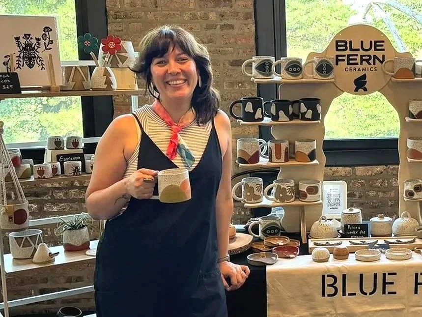 Hello, I’m Mine, the ceramic artist behind Blue Fern Ceramics. I am a self-taught maker working from my home studio in Arlington Heights, Illinois, where every piece is shaped, finished, glazed and fired.